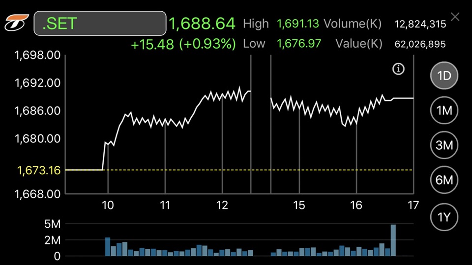– ตลาดหลักทรัพย์ปิดวันนี้ที่ระดับ 1,688.64 จุด เพิ่มขึ้น 15.48 จุด หรือร้อยละ