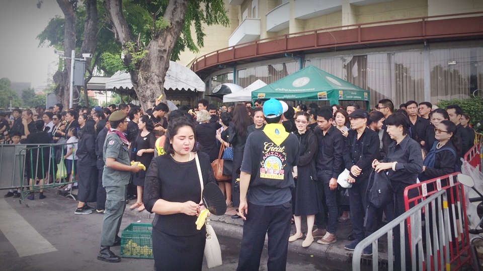 บรรยากาศโดยรอบพระบรมมหาราชวังในช่วง 2 วันสุดท้ายที่สำนักพระราชวัง เปิดให้ประชาชนเข้ากราบถวายบังคมพระบรมศพพระบาทสมเด็จพระปรมินทรมหาภูมิพลอดุลยเดช ณ พระที่นั่งดุสิตมหาปราสาทภายในพระบรมมหาราชวัง มีประชาชนทยอยเดินทางมาอย่างต่อเนื่อง ทำให้บริเวณจุดคัดกรองทั้ง 2จุดที่กองอำนวยการร่วมรักษาความสงบเรียบร้อยบริเวณโดยรอบพระบรมมหาราชวัง(กอร.รส.)จัดไว้คือ พระเเม่ธรณีบีบมวยผม ท้ายเเถวอยู่บริเวณเเยกคอกวัว ถนนราชดำเนินกลาง