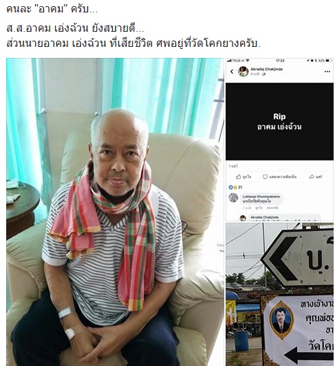 นายสมัชชา เอ่งฉ้วน สมาชิกสภาองค์การบริหารส่วนจังหวัด (ส.อบจ.) กระบี่ หลานของนายอาคม กล่าวว่า นายอาคม อดีตนักการเมือง ยังสบายดี แม้ป่วยเป็นโรคไต แต่ยังสามารถพูดคุยกับผู้มาเยี่ยมเยียนได้ปกติ ไม่ได้ป่วยหนักถึงกับนอนอยู่กับที่ หรือเสียชีวิตตามที่แชร์กันในโลกโซเชียล และจากการตรวจสอบเบื้องต้นป้ายชื่อของผู้เสียชีวิตนั้น พบว่าเป็นญาติห่าง ๆ กัน บังเอิญมีชื่อและนามสกุลเหมือนกันอีก อยู่ในพื้นที่ ต.โคกยาง อ.เหนือคลอง จ.กระบี่