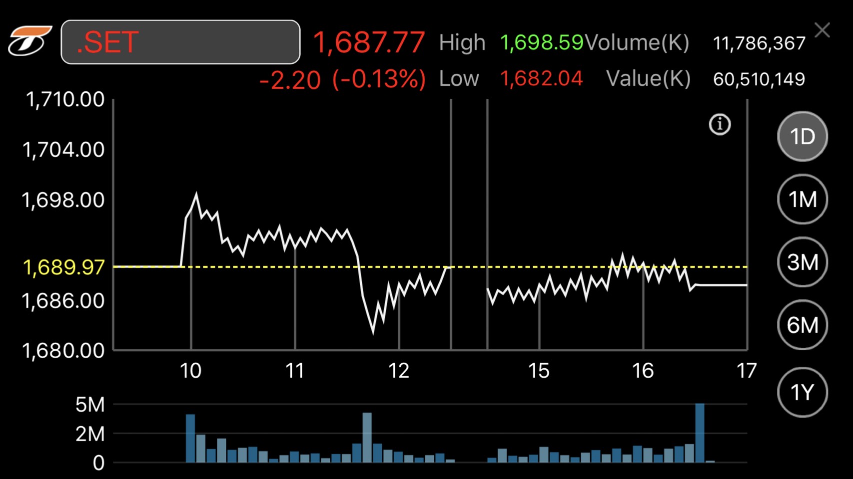 ผู้สื่อข่าวรายงานว่าดัชนีตลาดหลักทรัพย์ปิดการซื้อขายวันนี้ที่ระดับ 1,687.77 จุด ลดลง 2.20 จุด หรือร้อยละ 0.13 มูลค่าการซื้อขาย 60,510.15 ล้านบาท ตลาดหุ้นไทยพยายามจะขึ้นทดสอบระดับ 1,700 จุด แต่ยังไปไม่ถึง จึงย่อตัวลงมาเป็นการพักตัว หลังจากดัชนีปรับตัวขึ้นไปมากแล้ว โดยดัชนีสูงสุดของวันที่ระดับ 1,698.59 จุด และต่ำสุดที่ระดับ 1,682.04 จุด