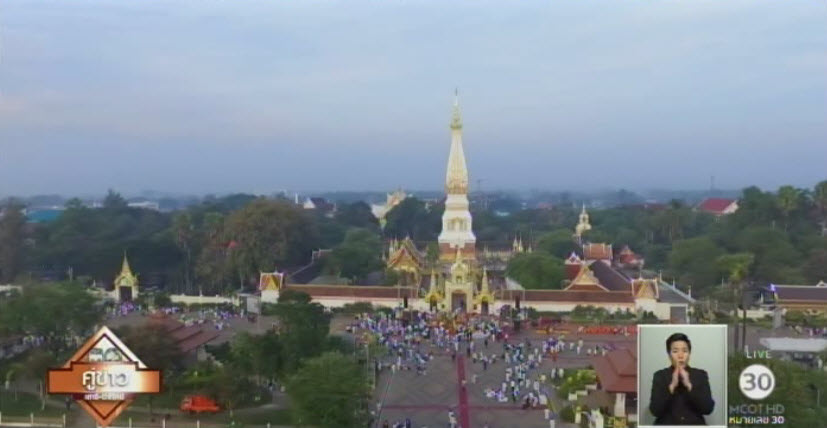 ที่วัดพระธาตุพนมวรมหาวิหาร อ.ธาตุพนม จ.นครพนม พุทธศาสนิกชน ประชาชน นักท่องเที่ยว ทั้งชาวไทย ชาวลาว นับหมื่นคน ร่วมพิธีทำบุญตักบาตร หลังจากตลอดคืนที่ผ่านมาได้ร่วมกันทำบุญปฏิบัติธรรมบูชาพระธาตุพนม เพื่อน้อมถวายเป็นพระราชกุศลและน้อมรำลึกในพระมหากรุณาธิคุณที่พระองค์ เคยเสด็จมาบำเพ็ญกุศล ที่วัดพระธาตุพนม ถึง 5 ครั้ง สำหรับกิจกรรมนี้เป็นความร่วมมือของการท่องเที่ยวแห่งประเทศไทย (ททท.) ร่วมกับวัดพระธาตุพนมวรมหาวิหาร สำนักงานพุทธศาสนาแห่งชาติ จ.นครพนม เทศบาลตำบลธาตุพนม และหอจดหมายเหตุพุทธทาส อินทปัญโญ จัดขึ้นเพื่อให้พุทธศาสนิกชน ทั้งชาวไทย ชาวลาว นุ่งขาวห่มขาว ร่วมปฏิบัติธรรม นั่งสมาธิ ทำบุญตักบาตร เพื่อถวายเป็นพระราชกุศล