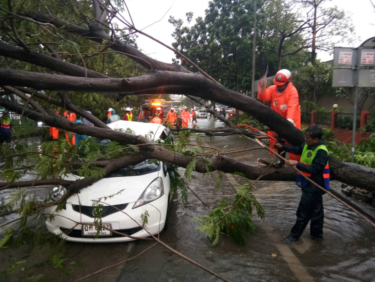 กรุงเทพฯ 7 ต.ค.- เมื่อเวลาประมาณ 15.20 น.บริเวณถนนกำแพงเพชร2ขนส่งจตุจักรฝนตกหนักลมแรง ทำให้ต้นไม้ล้มกีดขวางการจรจรและล้มทับรถยนต์ จุดแรกบริเวณถนนกำแพงเพชร 2 ด้านขาเข้าทางลงด่วนบางซื่อ ก่อนถึงแยก ปตท. ต้นไม้ล้มทั้งหมด 3 ต้นกีดขวางทุกช่องทาง และยังล้มทับ เสียหายหลายคัน , จุดที่สอง บริเวณใต้ทางด่วนเลยแยก ปตท.ต้นไม้เกาะกลาง ล้ม กีดขวาง1ช่องทางด้ านขวารถสามารถผ่านได้ 2 ช่องด้านซ้าย และจุดสุดท้าย ถนน กำแพงเพชรขาออก บริเวณจุดกลับรถเจ้าจอมกีด ขวาง 1 ช่องทางด้านขวา ส่งผลให้สภาพการจราจรด้านขาเข้าหนาแน่นเนื่องจาก รถยังผ่านไม่ได้ คันสุดท้ายต่อเนื่อง อยู่ที่กิโลเมตร 11 และอยู่ระหว่างดำเนินการใช้เลื่อยตัด ด้านขาออกจาก อตก.มุ่งหน้าจุดกลับรถเจ้าจอมรถมากยังเคลื่อนตัวได้ และเวลานี้ยังมีฝนตก เจ้าหน้าที่ตำรวจ ได้จัดชุดช่วยเหลือน้ำท่วม และ รถยกขนาดใหญ่ ออกช่วยเหลือแล้ว – สำนักข่าวไทย