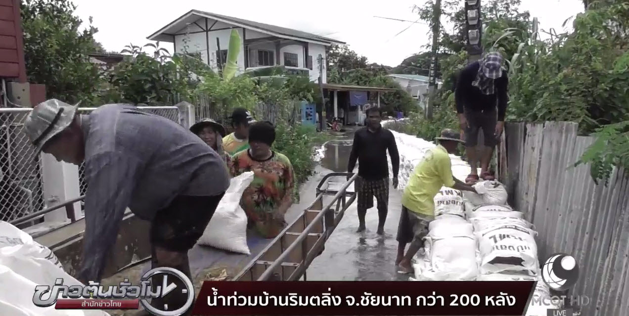 ชัยนาท 9 ต.ค. – น้ำท่วมบ้านเรือนริมตลิ่งนอกคันกั้นน้ำ อ.สรรพยา จ.ชัยนาท เพิ่มอีก ชาวบ้านเดือดร้อนกว่า 240 หลังคาเรือน ต้องนำสัตว์เลี้ยงหนีน้ำขึ้นไปอยู่บนชั้น 2 และเร่งเสริมคันกระสอบทรายกั้นน้ำ ตลอดแนวถนนระหว่างหมู่บ้านให้สูงขึ้นเป็น 1.20 เมตร เพื่อป้องกันน้ำไหลทะลักเข้าท่วมพื้นที่ทั้งหมดของหมู่บ้าน