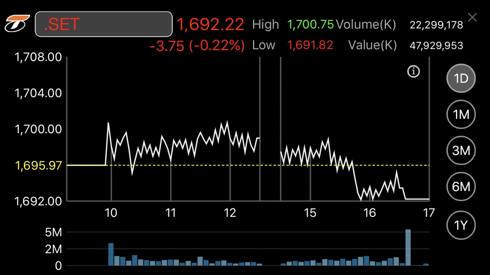 ผู้สื่อข่าวรายงานว่าดัชนีตลาดหลักทรัพย์ปิดที่ระดับ 1,692.22 จุด ลดลง 3.75 จุด หรือร้อยละ0.22 มูลค่าการซื้อขาย 47,929.95 ล้านบาท โดยการซื้อขายหุ้นวันนี้ดัชนีหุ้นไทยเคลื่อนไหวทั้งแดนบวก-ลบ แตะจุดสูงสุดที่ 1,700.75 จุด และต่ำสุดที่ระดับ 1,691.82 จุด