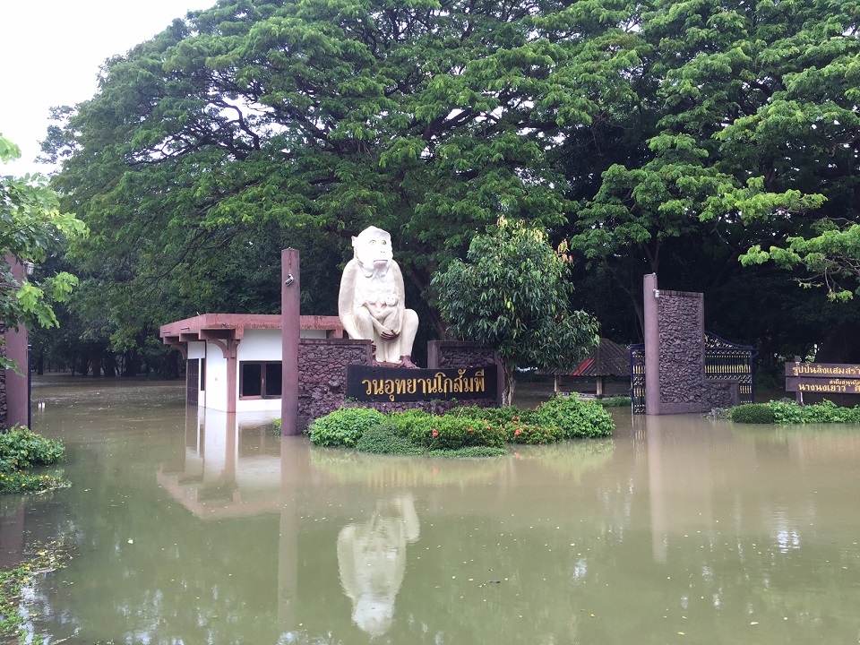 นายอภิชาติ การเกษ หัวหน้าวนอุทยานโกสัมพี อ.โกสุมพิสัย จ.มหาสารคาม เปิดเผยว่า รอบปีนี้วนอุทยานโกสัมพีเกิดน้ำท่วมเต็มพื้นที่ 125 ไร่ เป็นครั้งที่ 2 และจุดลึกที่สุดกว่า 4 เมตร อยู่ภายในอุทยานฯ เนื่องจากพื้นที่ด้านเหนือ คือ จังหวัดชัยภูมิ และเขื่อนอุบลรัตน์ จ.ขอนแก่น ได้ปรับเพิ่มการระบายน้ำจากเดิมวันละ 25 ล้านลูกบาศก์เมตร เป็นวันละ 34 ล้านลูกบาศก์เมตร ลงสู่แม่น้ำชีจนล้นตลิ่ง ล่าสุดระดับน้ำของแม่น้ำชีที่สถานี E91 อ.โกสุมพิสัย เมื่อเวลา 12.00 น. (10 ต.ค.) อยู่ที่ 12.01 เมตร เลยตลิ่งกว่า 30 เซนติเมตร นอกจากนี้ ยังส่งผลกระทบต่อลิงแสมทั้งขนสีเทาและขนสีทองกว่า 800 ตัว ที่อาศัยอยู่ในเขตวนอุทยานฯ ไม่สามารถหาอาหารตามธรรมชาติได้ ต้องอพยพมาอาศัยด้านหน้าวนอุทยานและตามต้นไม้ใหญ่ ตามกำแพงวัด และโรงเรียน