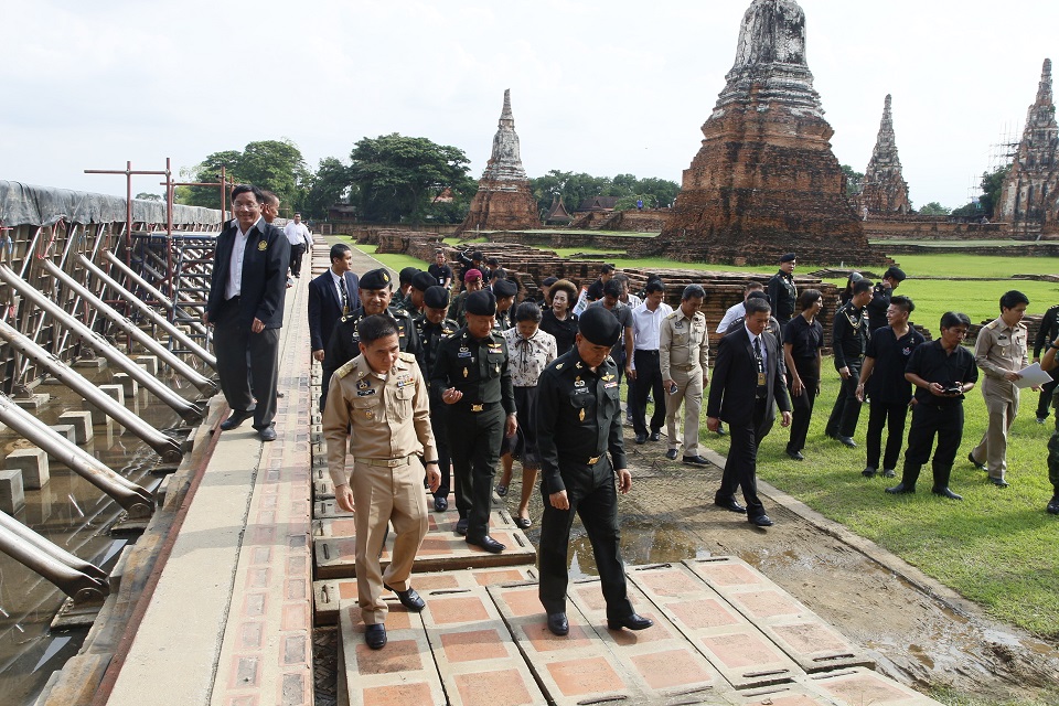 เมื่อเวลา 14.30 น. (10 ต.ค.) พล.อ.เฉลิมชัย สิทธิสาท ผู้บัญชาการกองทัพบก พร้อมนายสุจินต์ ไชยชุมศักดิ์ ผู้ว่าราชการจังหวัดพระนครศรีอยุธยา ลงพื้นที่ติดตามสถานการณ์แม่น้ำเจ้าพระยาขึ้นสูงในขณะนี้ โดยจุดแรกตรวจสภาพวัดไชยวัฒนาราม ตำบลบ้านป้อม อำเภอพระนครศรีอยุธยา ซึ่งเป็นโบราณสถานสำคัญและเป็นสถานที่ท่องเที่ยวพบว่ากรมศิลปากร ได้ยกเขื่อนป้องกันน้ำท่วมกึ่งถาวรขึ้นแล้ว เชื่อว่าจะไม่มีปัญหาน้ำท่วมวัด หรือหากน้ำมีแนวโน้มสูงขึ้นอีกก็สามารถเสริมเขื่อนป้องกันขึ้นได้อีก ส่วนประชาชนและนักท่องเที่ยวสามารถเดินทางเข้าเที่ยวชมโบราณสถานได้ตามปกติ