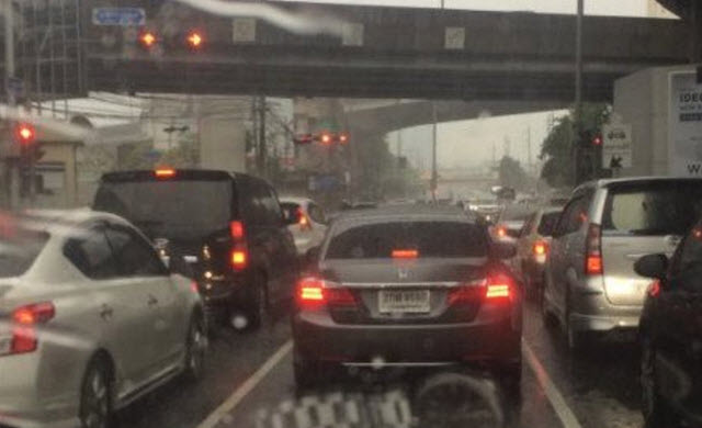 การจราจรถนนพหลโยธิน ขาออก เลยจากโลตัสรังสิตมา ฝนตก น้ำท่วม ในช่องทางด่วนเลนซ้าย