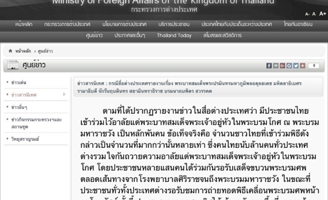 กระทรวงการต่างประเทศออกแถลงตามที่ได้ปรากฏรายงานข่าวในสื่อต่างประเทศว่ากรณีมีประชาชนไทยเข้าถวายสักการะแสดงความอาลัยพระบาทสมเด็จพระปรมินทรมหาภูมิพลอดุลยเดช เพื่อน้อมรำลึกถึงพระมหากรุณาธิคุณอย่างหาที่สุดมิได้ ณ พระบรมมหาราชวัง เป็นหลักพันคนนั้น ข้อเท็จจริง คือ จำนวนชาวไทยที่เข้าร่วมถวายสักการะเป็นจำนวนที่มากกว่านั้นหลายเท่า ซึ่งคนไทยนับล้านคนทั่วประเทศต่างรวมใจกันถวายสักการะและแสดงความอาลัย โดยประชาชนหลายแสนคนได้ร่วมกันรอรับเสด็จขบวนพระบรมศพ ตลอดเส้นทางจากโรงพยาบาลศิริราชจนถึงพระบรมมหาราชวัง ในขณะที่ประชาชนทั่วทั้งประเทศต่างรอชมการถ่ายทอดพิธีเคลื่อนพระบรมศพผ่านทางสถานีโทรทัศน์