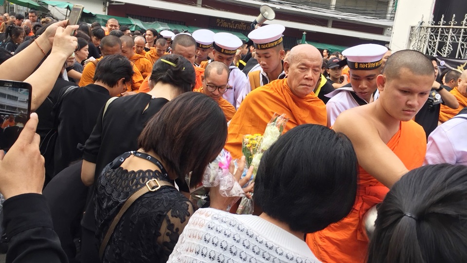 รพ.ศิริราช 13 ต.ค.-แพทย์พยาบาลข้าราชการและประชาชนจำนวนมากร่วมทำบุญตักบาตรพระสงฆ์ ตลอดเส้นทางตั้งแต่ หอประชุมกองทัพเรือจนถึง รพ.ศิริราช เพื่อถวายเป็นพระราชกุศลแด่ในหลวง รัชกาลที่ 9