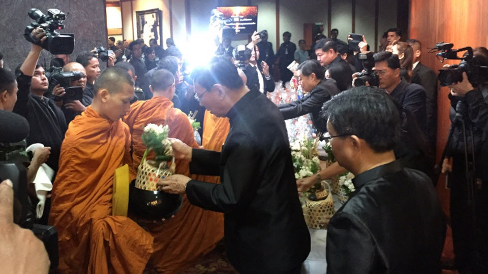 จากนั้น เป็นพิธีจุดเครื่องทองน้อยหน้าพระบรมฉายาลักษณ์พระบาทสมเด็จพระปรมินทรมหาภูมิพลอดุลยเดช ที่หน้าห้องประชุมใหญ่ชั้น 2 อาคารรัฐสภา 1 โดยประธาน สนช.กล่าวนำคำถวายสังฆทานเป็นพระราชกุศลแด่พระบาทสมเด็จพระปรมินทรมหาภูมิพลอดุลยเดช และตักบาตรข้าวสารอาหารแห้งแด่พระสงฆ์จำนวน 89 รูป