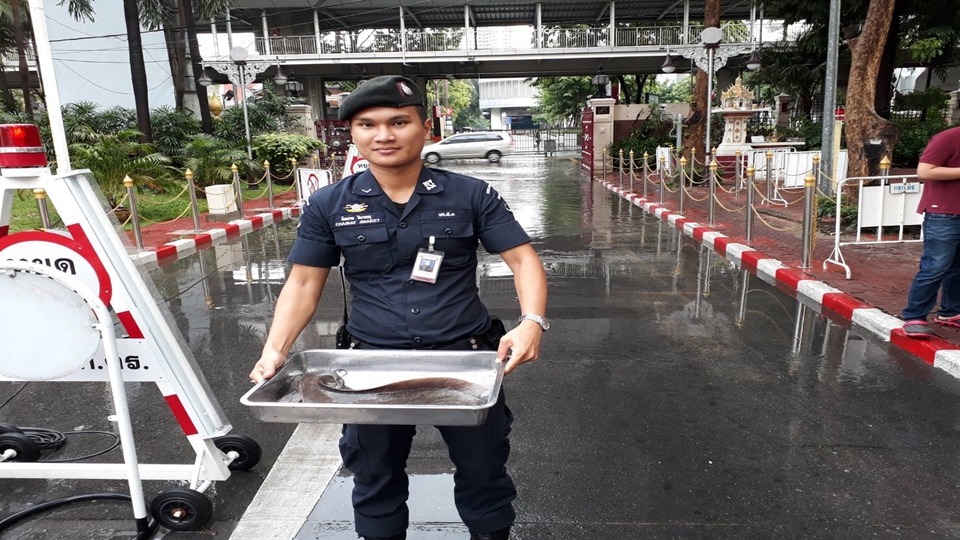 ขณะท่ีบริเวณหน้าประตูทางเข้าสำนักงานตำรวจแห่งชาติ ด้านถนนพระาม 1 เกิดน้ำท่วมขัง มีปลาดุกหลุดมาจากบ่อใต้อาคาร 1 ว่ายมาติดบริเวณหน้าป้อมรักษาความปลอดภัย ตำรวจสันนิบาลช่วยกันไล่จับได้ 2 ตัวใหญ่สร้างความสนุกสนานแก่เจ้าหน้าท่ีท่ีเข้าเวร รปภ.บริเวณประตูทางเข้า.-สำนักข่าวไทย