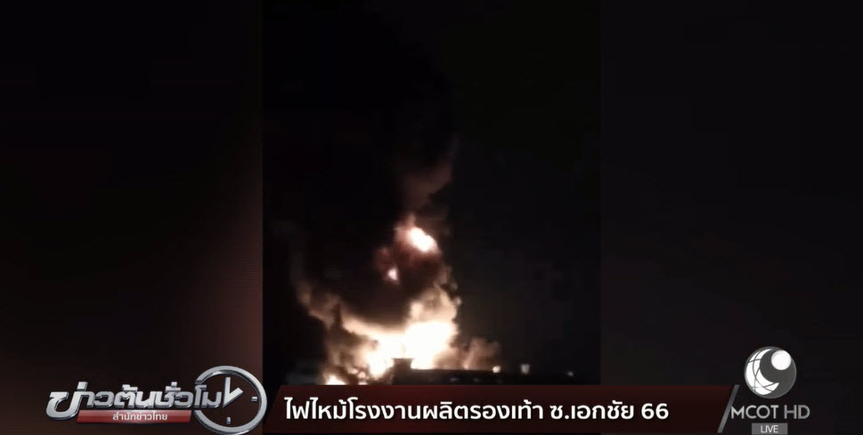 เจ้าหน้าที่สถานีดับเพลิงบางขุนเทียน เร่งระดมรถดับเพลิงเข้าระงับเหตุเพลิงไหม้ โรงงานผลิตรองเท้าแตะ ภายในซอยเอกชัย 66 ถนนเอกชัย แขวงและเขตบางบอน กรุงเทพฯ แต่ยังไม่สามารถระงับเหตุได้ เนื่องจากมีอุปสรรคทางเข้าไปโรงงาน มีน้ำท่วมขังสูงประมาณ 50 เซนติเมตร และล่าสุดเพลิงได้ลุกลามไปยังโกดังที่ 3 จากทั้งหมด 5 โกดัง รวมถึงมีเสียงระเบิดเกิดขึ้นเป็นระยะๆ และเจ้าหน้าที่ยังไม่สามารถตัดกระแสไฟฟ้าได้ อย่างไรก็ตามเบื้องต้นยังไม่มีรายงานผู้บาดเจ็บหรือเสียชีวิต และเจ้าหน้าที่สามารถนำรถดับเพลิงเข้าพื้นที่ได้แล้ว 10 คัน.-สำนักข่าวไทย