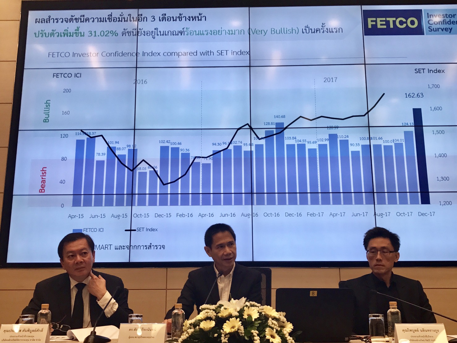 นายสันติ กีระนันท์ ผู้แทนสภาธุรกิจตลาดทุนไทย กล่าวว่า ดัชนีความเชื่อมั่นนักลงทุนเดือนตุลาคม 2560 ซึ่งสะท้อนดัชนีความเชื่อมั่นนักลงทุนในอีก 3 เดือนข้างหน้า คือ เดือนธันวาคม 2560 อยู่ที่ 162.63 ปรับตัวเพิ่มขึ้นร้อยละ 31.02 จากเดือนที่ผ่านมาที่ 124.13 อยู่ในเกณฑ์ร้อนแรงมาก ( Very Bullish ) ซึ่งเป็นระดับสูงสุดในรอบ 2 ปี 9 เดือน ตั้งแต่มีการสำรวจดัชนีความเชื่อมั่นนักลงทุนเมื่อเดือนมกราคม 2558
