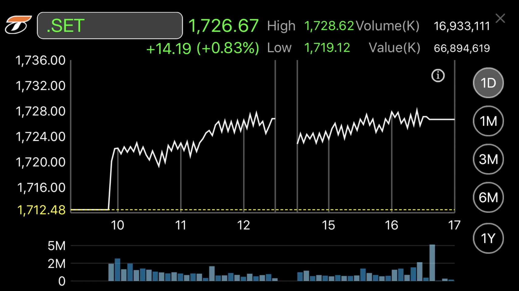 ผู้สื่อข่าวรายงานว่าดัชนีหุ้นไทยปิดวันนี้ที่ระดับ 1,726.67 จุด เพิ่มขึ้น 14.19 จุด หรือร้อยละ 0.83 มูลค่าการซื้อขาย 66,894.62 ล้านบาท การเคลื่อนไหวของดัชนีหุ้นไทยบวกตลอดทั้งวัน สูงสุดที่ 1,728.62 จุด และต่ำสุดของวันที่ 1,719.12 จุด เป็นไปตามทิศทางตลาดหุ้นต่างประเทศ ขณะที่มีแรงซื้อนำในหุ้นขนาดใหญ่เข้ามาหนาแน่น