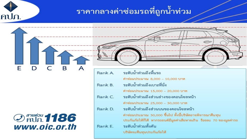 เลขาธิการ คปภ. กล่าวว่า การจ่ายค่าสินไหมทดแทนให้กับรถยนต์ที่ถูกน้ำท่วมจะต้องเป็นไปอย่างรวดเร็วมีประสิทธิภาพและเป็นธรรม โดยให้ยึดถือแนวปฏิบัติตามมาตรฐานการซ่อมรถยนต์ที่ถูกน้ำท่วม แบ่งเป็น 5 ระดับ คือ ระดับ A น้ำท่วมถึงพื้นรถยนต์ ประเมินค่าซ่อม 8,000-10,000 บาท ระดับ B น้ำท่วมถึงเบาะนั่ง ประเมินค่าซ่อม 15,000 -20,000 บาท ระดับ C น้ำท่วมถึงส่วนล่างของคอนโซลหน้า ประเมินค่าซ่อม 25,000-30,000 บาท ระดับ D น้ำท่วมถึงส่วนบนของคอนโซลหน้า ประเมินค่าซ่อมเริ่มต้นที่ 30,000 บาทขึ้นไป และระดับ E รถยนต์จมน้ำทั้งคัน ซึ่งในกรณีนี้บริษัทผู้รับประกันภัยจะคืนทุนประกันภัยให้กับผู้รับประกันภัยสถานเดียว ทั้งนี้ จากรายงานดังกล่าว พบว่ารถยนต์ส่วนใหญ่ร้อยละ 70 จาก 3,155 คัน ถูกน้ำท่วมในระดับ A-B จึงกำชับให้บริษัทประกันภัยรถยนต์ดังกล่าวเร่งรัดในการจ่ายค่าสินไหมทดแทนด้วย