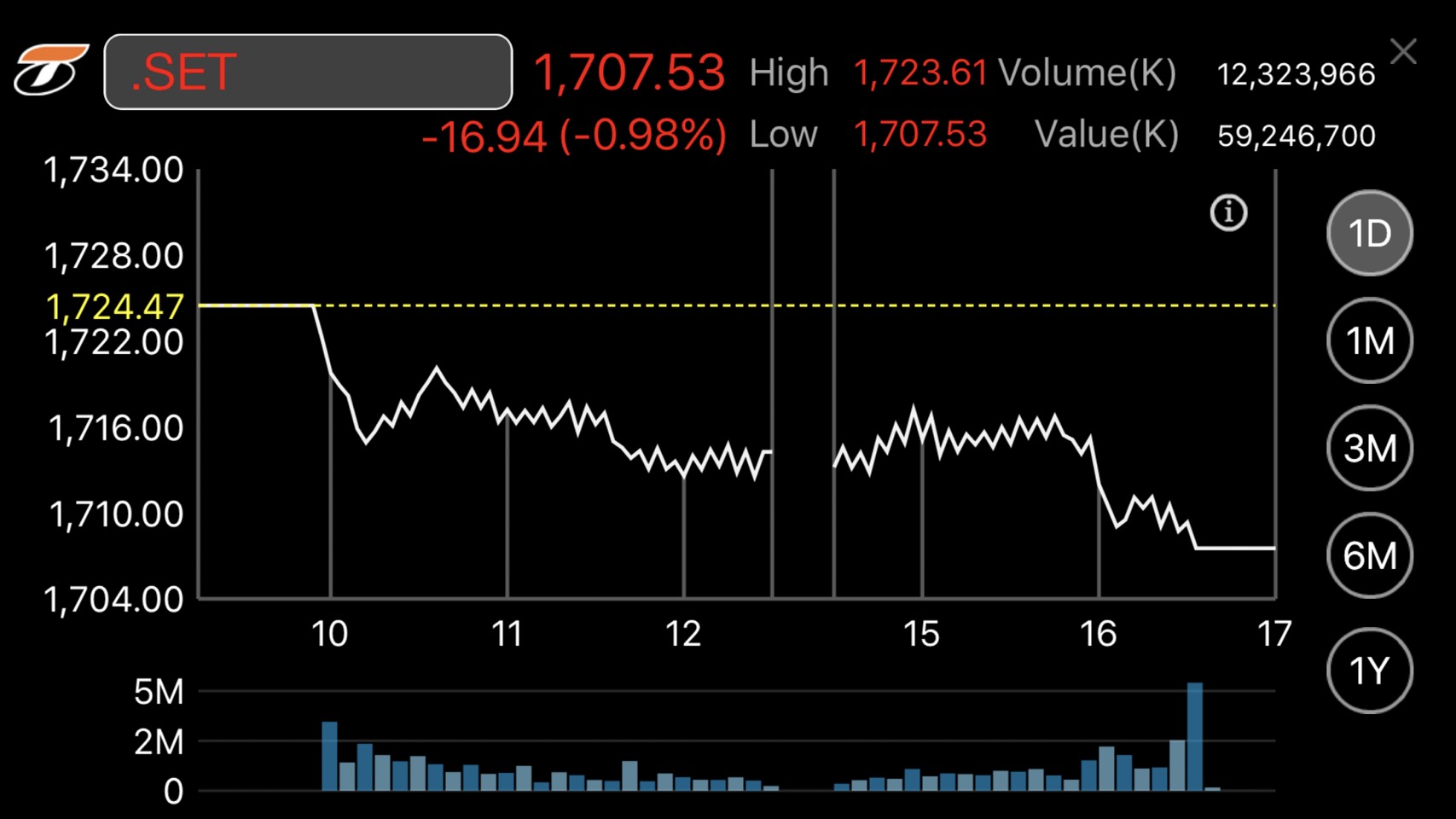 ผู้สื่อข่าวรายงานว่าดัชนีตลาดหุ้นไทยปิดที่ 1,707.53 จุด ลดลง 16.94 จุด หรือ ร้อยละ 0.99 มูลค่าการซื้อขาย 59,246.70 ล้านบาท ตลอดวันหุ้นไทยเคลื่อนไหวแดนลบ
