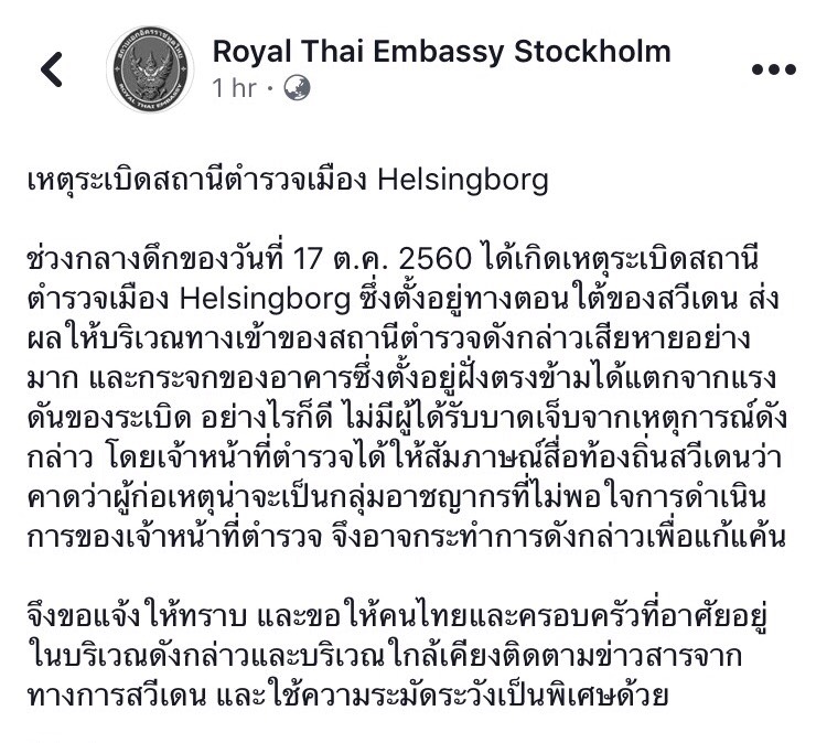 อสมท 18 ต.ค.-บึ้มสถานีตำรวจเมือง Helsingborg ทางตอนใต้ของสวีเดน สถานเอกอัครราชทูต ณ กรุงสตอกโฮม เตือนคนไทยใช้ความระมัดระวังเป็นพิเศษ