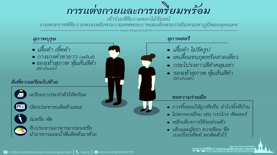 คณะกรรมการฝ่ายประชาสัมพันธ์งานพระราชพิธีถวายพระเพลิงพระบรมศพพระบาทสมเด็จพระปรมินทรมหาภูมิพลอดุลยเดช เผยแพร่ผ่าน เว็บไซต์ ingrama9.th เรื่องการแต่งกายและการเตรียมพร้อมเข้าร่วมพิธีถวายดอกไม้จันทน์ งานพระราชพิธีถวายพระเพลิงพระบรมศพ พระบาทสมเด็จพระปรมินทรมหาภูมิพลอดุลยเดช