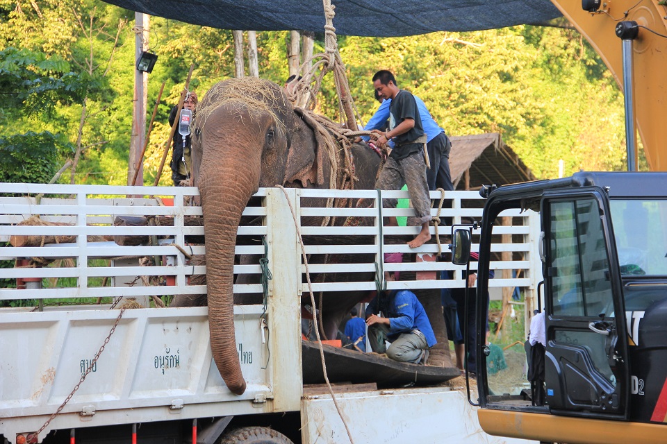 เมื่อมาถึงนายสัตวแพทย์ทวีโภค อังควานิช ผู้จัดการส่วนงานอนุรักษ์และบริบาลช้าง สัตวแพทย์ประจำของสถาบันคชบาลแห่งชาติ ในพระอุปถัมภ์ฯ องค์การอุตสาหกรรมป่าไม้ จ.ลำปาง ได้ให้เคลื่อนรถบรรทุกเข้าไปยังบริเวณแนวป่าใกล้กับอ่างเก็บน้ำและโรงเรียนฝึกควาญช้าง ภายในศูนย์อนุรักษ์ช้างไทย ซึ่งเจ้าหน้าที่ต้องรอให้ฟ้าสว่างก่อนทำการเคลื่อนย้ายช้างลงจากรถ เบื้องต้นช้างยังสามารถขยับตัวไปมาได้ และมีการให้สารน้ำเข้าหลังใบหู พร้อมกันนี้เจ้าหน้าที่ต้องประสานให้รถแบ็คโฮอีกคันเข้ามายังพื้นที่ เพื่อยกตัวช้างลงมายังบริเวณรักษา จากนั้นเริ่มเคลื่อนย้ายช้างลงอย่างระมัดระวัง หลังจากให้ช้างได้พักประมาณ 2 ชั่วโมง
