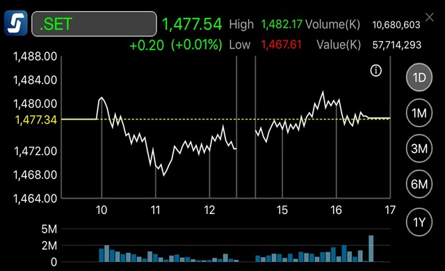 ตลท. 18 ต.ค. – ผู้สื่อข่าวรายงานว่าดัชนีหุ้นไทยปิดการซื้อขายวันนี้ที่ระดับ 1,477.54 จุด เพิ่มขึ้น 0.20 จุด หรือ ร้อยละ 0.01 มูลค่าการซื้อขาย 57,714.29 ล้านบาท ตลาดหุ้นไทยแกว่งตัวทั้งแดนบวก และ ลบ โดยระหว่างวันสูงสุดที่ระดับ 1,482.17 จุด และ ต่ำสุดที่ 1,467.61 จุด โดยตลาดไร้ปัจจัยบวกกระตุ้น