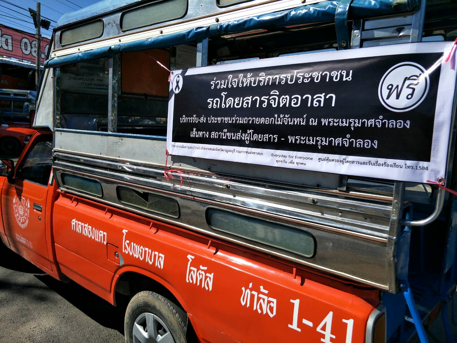 จากนั้น ผู้ว่าราชการจังหวัดกาญจนบุรี พร้อมคณะได้ขึ้นรถสองแถว ออกประชาสัมพันธ์เชิญชวนให้ประชาชน ใช้บริการรถสองแถวในการเดินทางไปร่วมพิธีถวายดอกไม้จันทน์ โดยรถสองแถวจะออกรับส่งบริเวณรอบๆเมือง ตั้งแต่ตลาดโรงเกลือแยกท่าล้อ ไปยังพระเมรุมาศจำลอง จุดถวายดอกไม้จันทน์ ข้ามสะพานแม่น้ำแควใหญ่ สนามกีฬาเทศบาลเมืองกาญจนบุรี โดยรถสองแถวที่เข้าโครงการฯจะให้บริการแก่ประชาชนฟรี เพื่อร่วมใจถวายความอาลัยแด่พระบาทสมเด็จพระปรมินทรมหาภูมิพลอดุลยเดช ในวันที่ 26 ต.ค.60 ตั้งแต่เวลา 07.00 น.เป็นต้นไป