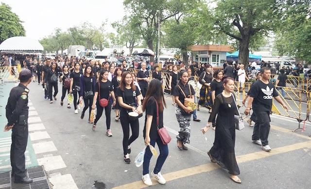บรรยากาศที่บริเวณพระบรมมหาราชวัง แม้อากาศจะร้อนอบอ้าวก็ไม่ได้เป็นอุปสรรคให้ประชาชนที่ต้องการเข้าถวายสักการะ แสดงความอาลัย เพื่อน้อมรําลึกถึงพระมหากรุณาธิคุณอย่างหาที่สุดมิได้ ทุกคนยังคงยืนเข้าเเถวเพื่อรอการเรียกเข้าไปภายในพระบรมมหาราชวัง โดยทหารคอยบริการฉีดน้ำจากฟ็อกกี้เพื่อคลายความร้อนของอากาศ บางส่วนเตรียมแอมโมเนียให้ประชาชน ส่วนใหญ่ต่างเตรียมแว่นกันแดด หมวก ร่ม และยาดมไว้พร้อม