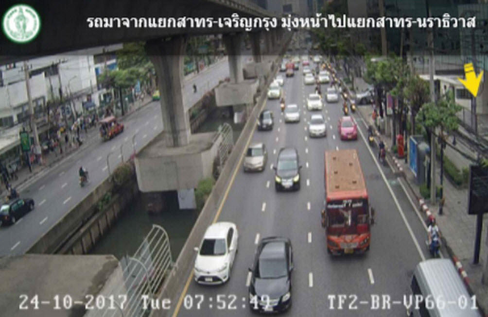 กทม. 24 ต.ค.-สวพ.FM91 รายงานจราจรเช้าวันอังคาร ฝนถล่มกรุง ถนนสาทรเหนือ ขาเข้า มุ่งหน้ามาทางแยกนรินทร รถมาก
