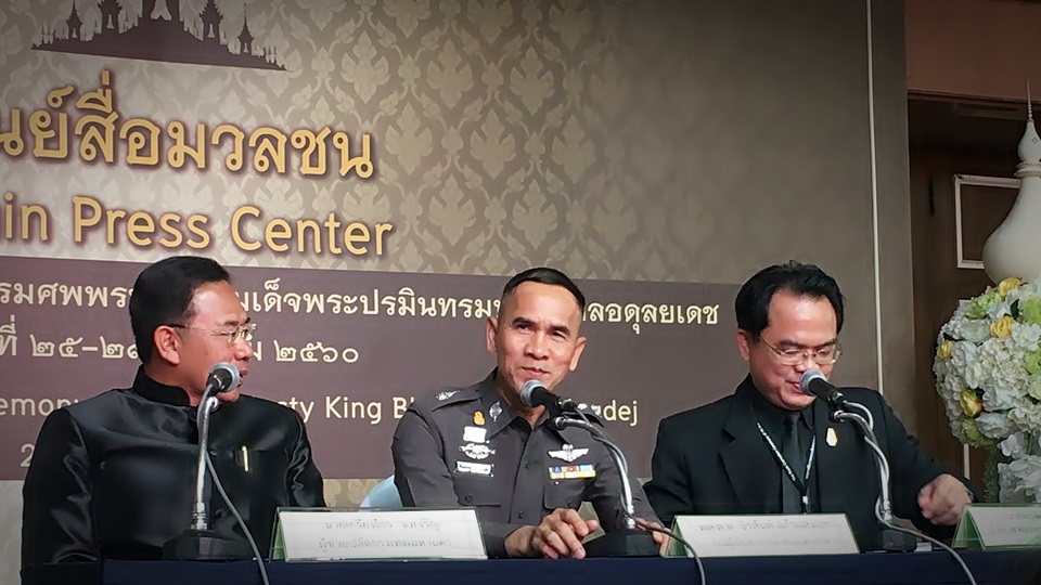 นายพรพิทักษ์ แม้นศิริ ผู้เชี่ยวชาญเฉพาะด้านการประชาสัมพันธ์ พร้อมด้วย พล.ต.ต.จิรสันต์ แก้วแสงเอก รองผู้บัญชาการตำรวจนครบาล และนายเกรียงไกร จงเจริญ ผู้ช่วยปลัดกรุงเทพมหานคร แถลงข่าว กอร.พระราชพิธีฯ เรื่องความพร้อมงานพระราชพิธีถวายพระเพลิงพระบรมศพพระบาทสมเด็จพระปรมินทรมหาภูมิพลอดุลยเดช การอำนวยความสะดวกและการดูแลประชาชน ที่เข้าร่วมในงานพระราชพิธีฯ โดยระบุว่าเวลา 10.00 น.ที่ผ่านมามีประชาชนเดินทางเข้ามณฑลพิธีท้องสนามหลวงจากจุดคัดกรองต่างๆ รวมทั้งสิ้น 23,000 คนแล้ว โดยจุดที่มีประชาชนเข้ามาหนาแน่นมากที่สุดคือจุดคัดกรองที่4 บริเวณสะพานช้างโรงสี รองลงมาจุดคัดกรองที่ 5 คือพระแม่ธรณีบีบมวยผม และจากการประเมินของ กอร.พบขณะนี้บริเวณจุดคัดกรองพระแม่ธรณีบีบมวยผม รองรับประชาชนหนาแน่นเต็มพื้นที่จึงจำเป็นต้องปิดจุดคัดกรอง ทำให้เหลือจุดคัดกรองเพียง 8 จุดเท่านั้น ในการเข้ามณฑลพิธีท้องสนามหลวง ซึ่งจากการประเมิน แบบวัดตารางเมตร จุดพระแม่ธรณีบีบมวยผมจะรองรับประชาชนได้เพียง14,335 คนเท่านั้น สำหรับพื้นที่ท้องสนามหลวงทั้งหมดนั้น จากการประเมินจะสามารถรองรับได้ประชาชน ถึง 100,000 คน โดยจะเปิดให้เข้าเพื่อรองรับประชาชน