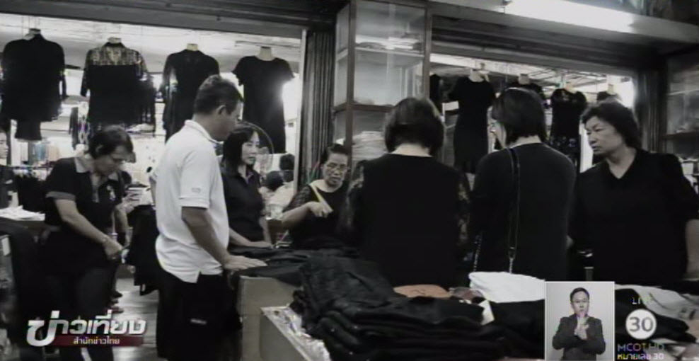 ภูมิภาค 18 ต.ค. – ประชาชนในหลายจังหวัดต่างพากันออกหาซื้อเสื้อและเครื่องแต่งกายสีดำ เพื่อสวมใส่ไว้ทุกข์ แสดงความอาลัยพระบาทสมเด็จพระปรมินทรมหาภูมิพลอดุลยเดช จนบางแห่งเริ่มขาดตลาด