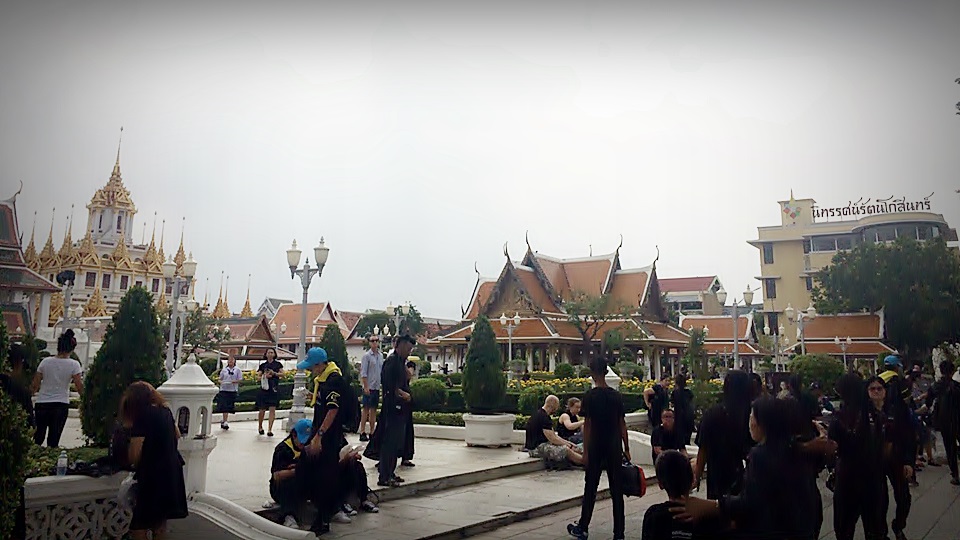 บรรยากาศที่ถนนราชดำเนินกลาง ยังมีประชาชนจากทั่วสารทิศหอบกระเป๋าสัมภาระ ทยอยเดินทางมาร่วมเป็นส่วนหนึ่งในพระราชพิธีถวายพระเพลิงพระบรมศพพระบาทสมเด็จพระปรมินทรมหาภูมิพลอดุลยเดช ทำให้ขณะนี้บริเวณจุดคัดกรองพระเเม่ธรณีบีบมวยผม ท้ายเเถวอยู่ด้านหน้าลานพลับพลามหาเจษฎาบดินทร์ วัดราชนัดดารามวรวิหาร เเต่ทุกคนต่างมุ่งมั่นเเละตั้งใจเข้าไปพื้นที่ใกล้เคียงให้ได้มากที่สุด เเม้จะมีผู้คนจำนวนมาก เเละสภาพอากาศจะเเปรปรวนก็ตาม