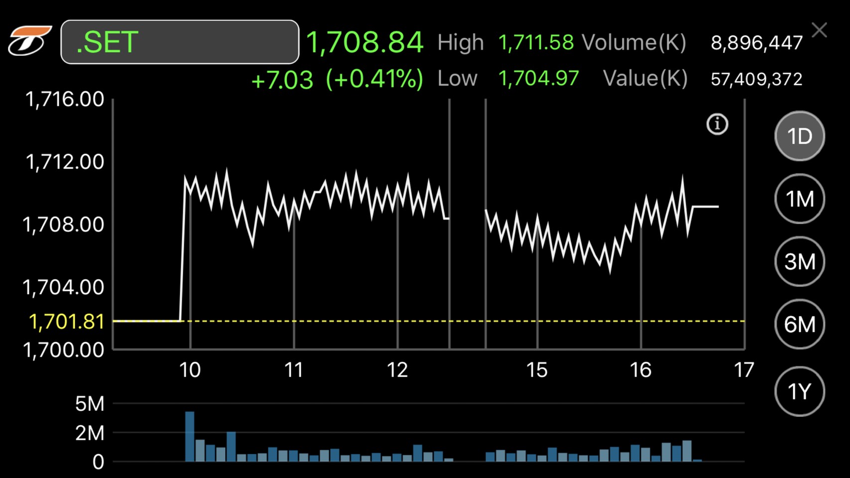 ผู้สื่อข่าวรายงานว่าดัชนีตลาดหลักทรัพย์ปิดการซื้อขายที่ระดับ 1,708.84 จุด เพิ่มขึ้น 7.03 จุด หรือร้อยละ 0.41 มูลค่าการซื้อขาย 57,626.26 ล้านบาท การเคลื่อนไหวตลาดหุ้นไทยวันนี้อยู่แดนบวกตลอดวัน โดยปรับขึ้นสูงสุดที่ระดับ 1,711.58 จุด และต่ำสุดของวันที่ระดับ 1,704.97 จุด