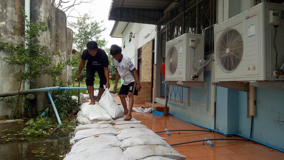 สภาพพื้นที่ในเขตโรงพยาบาลส่งเสริมสุขภาพประจำตำบลบุ่งคล้า-ท่างาม ต.ลาดพัฒนา อ.เมือง จ.มหาสารคาม วันนี้ (25 ต.ค.) เริ่มมีน้ำไหลเข้าท่วม 5-15 เซนติเมตร จากแม่น้ำชีล้นตลิ่ง เจ้าหน้าที่จึงช่วยกันวางกระสอบทรายกั้นน้ำและใช้เครื่องสูบน้ำออก เพื่อไม่ให้น้ำท่วมภายในอาคาร