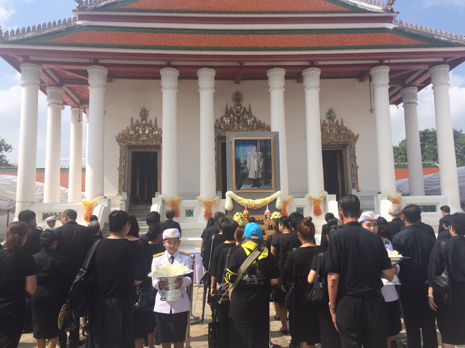 กทม. 26 ต.ค. –ผู้สื่อข่าวรายงานบรรยากาศที่วัดมกุฏกษัตริยาราม ซึ่งเป็นวัดอารามหลวงชั้นโท และถือเป็นอีกหนึ่งจุดที่เปิดให้ประชาชนถวายดอกจันทน์ในพระราชพิธีถวายพระเพลิงพระบรมศพพระบาทสมเด็จพระปรมินทรมหาภูมิพลอดุลยเดช ณ ด้านหน้าพระอุโบสถของวัด มีประชาชนทยอยเดินทางมาร่วมถวายดอกไม้จันทน์กันเป็นจำนวนมาก ซึ่งตั้งเเต่เวลา 9.00 น.ที่เปิดให้ถวายผ่านไปกว่า 1 ชั่วโมงมีประชาชนได้ถวายเเล้วเกือบ 2,000 คน โดยหลังจากที่ทุกคนได้ถวายดอกไม้จันทน์แล้วจะได้รับหนังสือ 2 เล่ม ได้เเก่ หนังสือพระมหากษัตริย์ยอดกตัญญู เเละหนังสือธรรมของพระราชาเเละเเผ่นพับภาพรวมงานพระราชพิธีถวายพระเพลิงพระบรมศพ