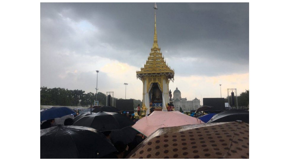 บรรยากาศที่พระลานพระราชวังดุสิต ประชาชนจำนวนมากที่เดินทาง มาถวายดอกไม้จันทน์ ในงานพระราชพิธีถวายพระเพลิงพระบรมศพพระบาทสมเด็จพระปรมินทรมหาภูมิพลอดุลยเดชบรมนาถบพิตร ณ พระเมรุมาศจำลอง แม้ขณะนี้ฝนตกลงมาอย่างหนัก ทำให้การถวายดอกไม้จันทน์เป็นไปด้วยความยากลำบากมากยิ่งขึ้น แต่ทุกคนต่างไม่ย่อท้อ กางร่มสวมชุดกันฝน ยืนต่อแถวท่ามกลางสายฝน โดยขณะนี้มีประชาชนหลั่งไหลมาที่จุดนี้มากขึ้น เนื่องจากเสร็จสิ้นพระราชพิธีออกพระเมรุ ทำให้ประชาชนบางส่วนเดินทางมาสมทบ เจ้าหน้าที่และจิตอาสาช่วยกันจัดแถวให้เป็นระเบียบ