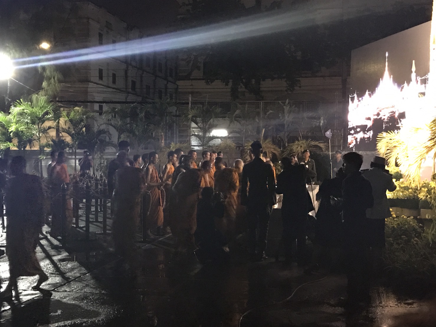 ขณะที่เจ้าหน้าที่ตำรวจ ยังคงดูแลความเรียบร้อยและความปลอดภัยบริเวณโดยรอบ ขณะที่จิตอาสายังคงแจกจ่ายอาหารและน้ำดื่มให้กับประชาชนที่เดินทางมาถวายดอกไม้จันทน์อย่างต่อเนื่อง