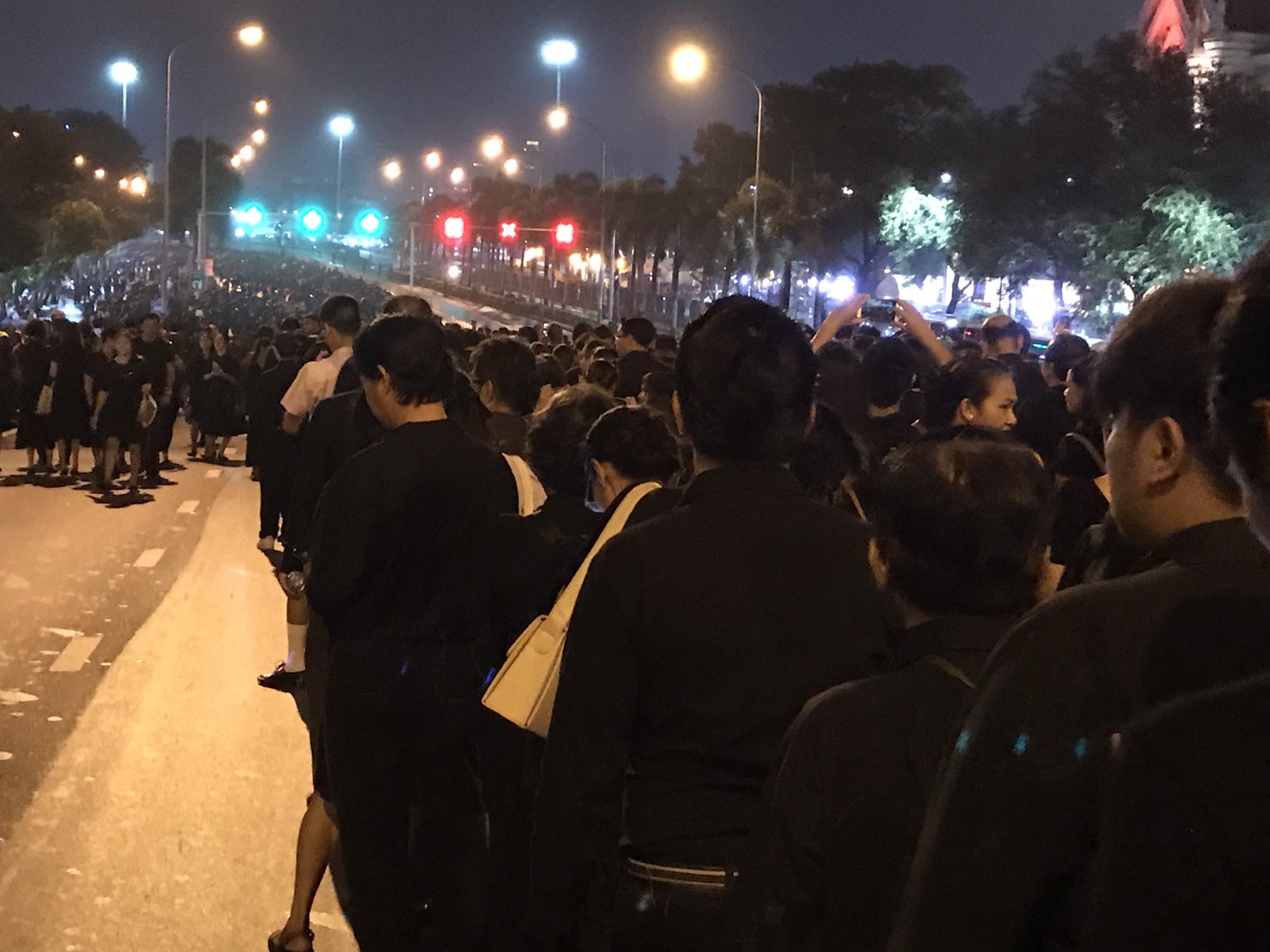 สะพานสมเด็จพระปิ่นเกล้า 26 ต.ค.-ประชาชนเข้าแถววางดอกไม้จันทน์ ณ พระเมรุมาศจำลอง บริเวณกองสลากเก่า ตรงข้ามโรงแรมรัตนโกสินทร์ ท้ายแถวยาวเกือบถึงกลางสะพานสมเด็จพระปิ่นเกล้า