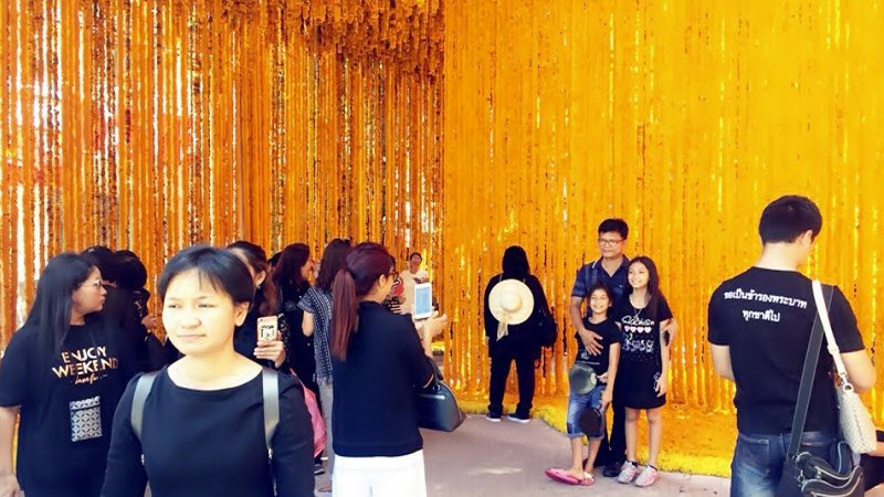 บรรยากาศที่ย่านปากคลองตลาด เป็นไปด้วยความเรียบร้อย ประชาชนยังคงทยอยเข้าชื่นชมอุโมงค์ดอกไม้เพื่อพ่อ ที่ชาวชุมชนปากคลองตลาดและจิตอาสากว่า 4,000 คน ร่วมใจกันเนรมิตถนนจักรเพชร นำดอกไม้จำนวนหลายล้านดอก และต้นดาวเรืองกว่า 100,000 ต้น มาตกแต่งเป็นอุโมงค์ดอกไม้เพื่อพ่อ ตลอดแนวถนนความยาวกว่า 400 เมตร ให้สวยสดงดงามอย่างต่อเนื่อง และไม่ลืมที่จะเก็บบันทึกภาพไว้เป็นที่ระลึก