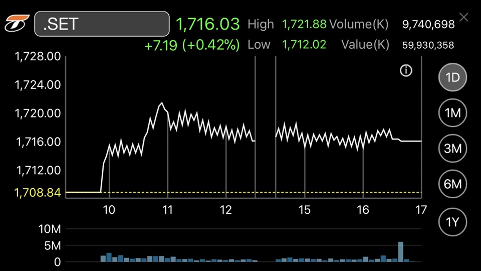 ผู้สื่อข่าวรายงานว่าดัชนีตลาดหลักทรัพย์ปิดตลาดที่ระดับ 1,716.03 จุด เพิ่มขึ้น 7.19 จุด หรือร้อยละ 0.42 มูลค่าการซื้อขาย 59,930.36 ล้านบาท โดยการซื้อขายหุ้นวันนี้ดัชนีเคลื่อนไหวแดนบวกตลอดวัน แตะจุดสูงสุดที่ 1,721.88 จุด และแตะจุดต่ำสุดที่ระดับ 1,712.02 จุด
