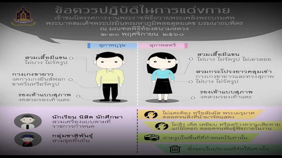 วธ.29 ต.ค.-ก.วัฒนธรรม แจ้งข้อปฏิบัติการแต่งกาย การเข้าชมนิทรรศการพระเมรุมาศ ย้ำแต่งกายสุภาพเสื้อ กางเกง กระโปรงไม่บาง ไม่รัดรูป งดรองเท้าแตะ งดสัมผัสพระเมรุมาศ
