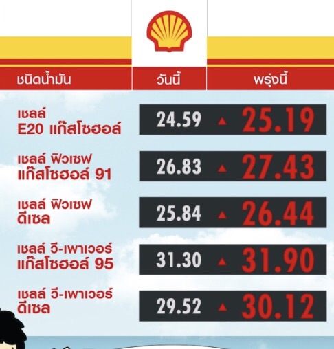 30 ต.ค. –เชลล์ประกาศขึ้นราคาน้ำมันทุกประเภท 60 สตางค์/ลิตร มีผลพรุ่งนี้ (31