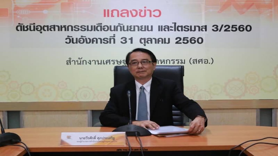 นายวีรศักดิ์ ศุภประเสริฐ รองผู้อำนวยการ สำนักงานเศรษฐกิจอุตสาหกรรม (สศอ.) เปิดเผยดัชนีผลผลิตอุตสาหกรรม (MPI) เดือนกันยายน 2560 ว่า ขยายตัวต่อเนื่องร้อยละ 4.2 เมื่อเทียบจากช่วงเดียวกันปีก่อน โดยเฉพาะอุตสาหกรรมยานยนต์ขยายอัตราการผลิตอย่างต่อเนื่อง ส่งผลให้ดัชนีผลผลิตอุตสาหกรรมไตรมาส 3 ขยายตัวร้อยละ 4.0 เมื่อเทียบจากช่วงเดียวกันในปีก่อน และภาพรวมดัชนีผลผลิตอุตสาหกรรม 9 เดือนของปี 2560 ขยายตัวร้อยละ 1.4 เข้าใกล้เป้าหมายสูงสุดการขยายตัวของดัชนีผลผลิตอุตสาหกรรมปี 2560 ทั้งปีที่ตั้งเป้าหมายไว้ที่ร้อยละ 1.5