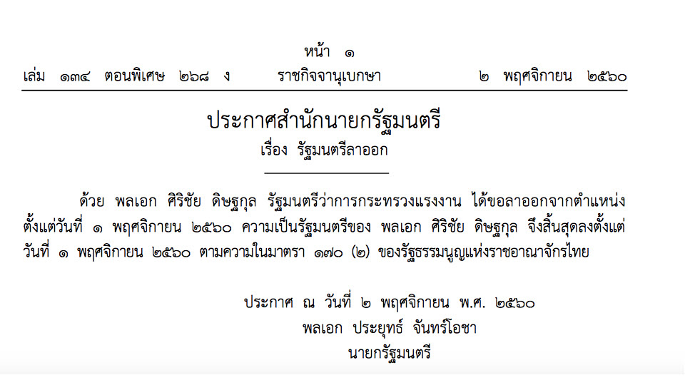 กรุงเทพฯ 2 พ.ย.- ผู้สื่อข่าวรายงานว่า เมื่อช่วงบ่าย วันนี้ (2 พ.ย.) ราชกิจจานุเบกได้ลงประกาศสำนักนายกรัฐมนตรี เรื่องรัฐมนตรีลาออก ระบุว่า ด้วย พล.อ.ศิริชัย ดิษฐกุล รัฐมนตรีว่าการกระทรวงแรงงาน ได้ขอลาออกจากตําแหน่งตั้งแต่วันที่ 1 พฤศจิกายน 2560 ความเป็นรัฐมนตรีของ พล.อ.ศิริชัย ดิษฐกุล จึงสิ้นสุดลงตั้งแต่วันที่ 1 พฤศจิกายน 2560 ตามความในมาตรา 170 (2) ของรัฐธรรมนูญแห่งราชอาณาจักรไทย