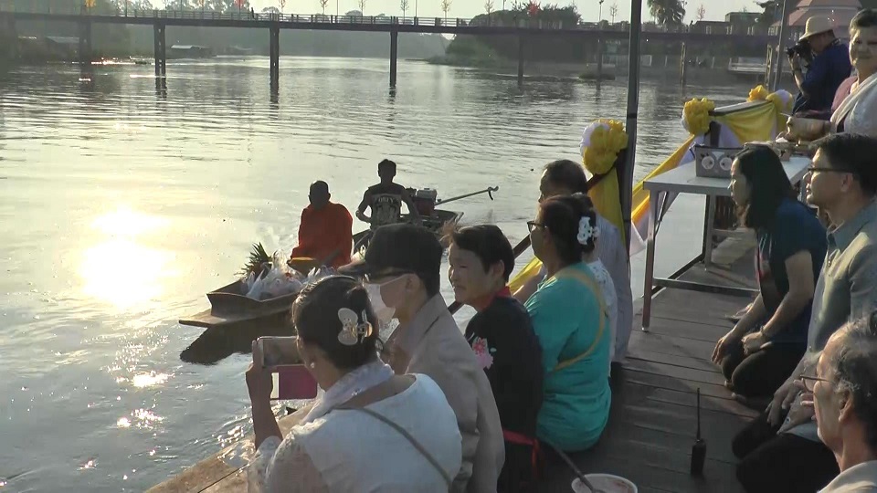 บรรยากาศเช้านี้ (3 พ.ย.) บริเวณแพท่าน้ำริมแม่น้ำสะแกกรัง ฝั่งตรงข้ามวัดอุโปสถาราม หรือวัดโบสถ์ โบราณสถานสำคัญของจังหวัดอุทัยธานี ชาวบ้านและนักท่องเที่ยวร่วมกันทำบุญตักบาตรทางน้ำ เพื่อเป็นสิริมงคลในวันพระใหญ่ของวันเพ็ญเดือนสิบสอง หรือวันลอยกระทง โดยประชาชนทุกคนต่างตั้งจิตอธิษฐานเพื่อน้อมเกล้าถวายเป็นพระราชกุศลแด่พระบาทสมเด็จพระปรมินทรมหาภูมิพลอดุลยเดช บรมนาถบพิตร (รัชกาลที่ 9)