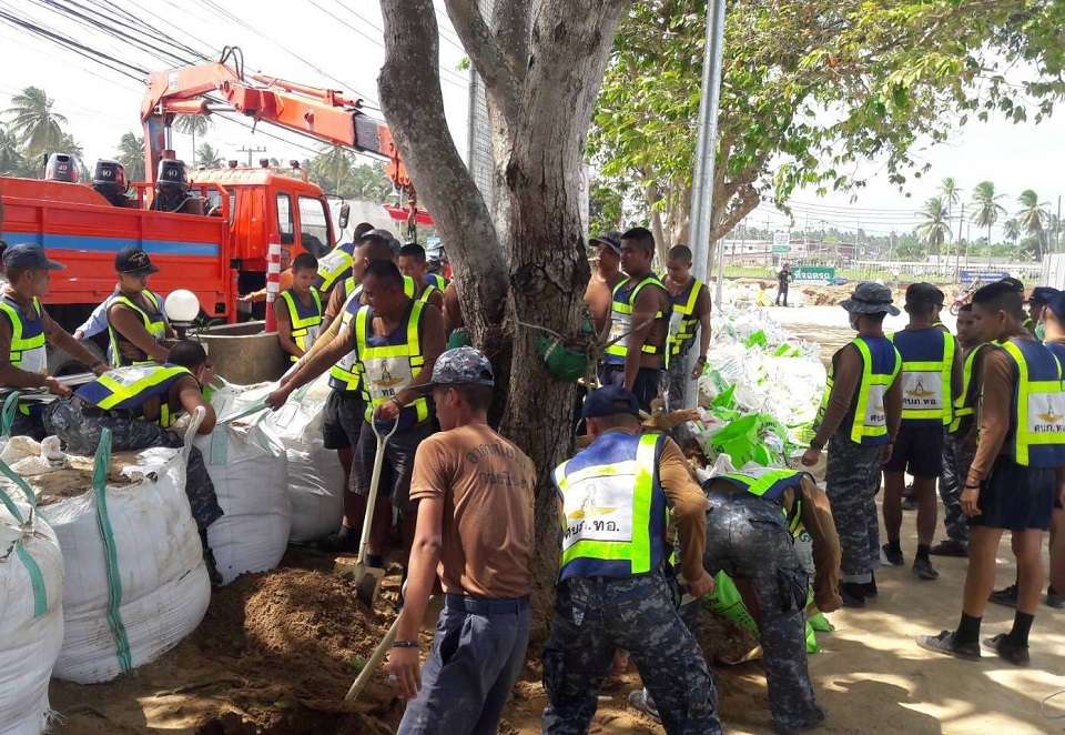 นาวาอากาศเอก อนิรุทธ์ รัฐพร ผู้บังคับการกองบิน 5 อ.เมือง จ. ประจวบคีรีขันธ์ ในฐานะผู้อำนวยการศูนย์บรรเทาสาธารณภัย กองบิน 5 นำเจ้าหน้าที่วางแนวกระสอบทรายขนาดใหญ่หรือบิ๊กแบ็คให้สูงกว่าพื้นถนน 1 เมตร เพื่อป้องกันน้ำท่วมโรงพยาบาลบางสะพาน ซึ่งเป็นที่จุดลุ่มต่ำอาจเกิดปัญหาน้ำท่วมอีก หลังกรมอุตุนิยมวิทยาประกาศเพิ่มเติมเตรียมรับมือพายุโซนร้อน “ดอมเรย์” คาดว่าพัดผ่านพื้นที่ภาคใต้และประจวบคีรีขันธ์ช่วงวันที่ 4-6 พ.ย.นี้ ขณะที่โรงพยาบาลบางสะพานได้วางระบบภายในรับมือไว้แล้ว โดยเฉพาะเรื่องไฟฟ้าน้ำประปาสามารถใช้ได้ตามปกติ และไม่ต้องย้ายผู้ป่วยทั้งหมดเหมือนที่ผ่านมาเมื่อมีปัญหาน้ำท่วม