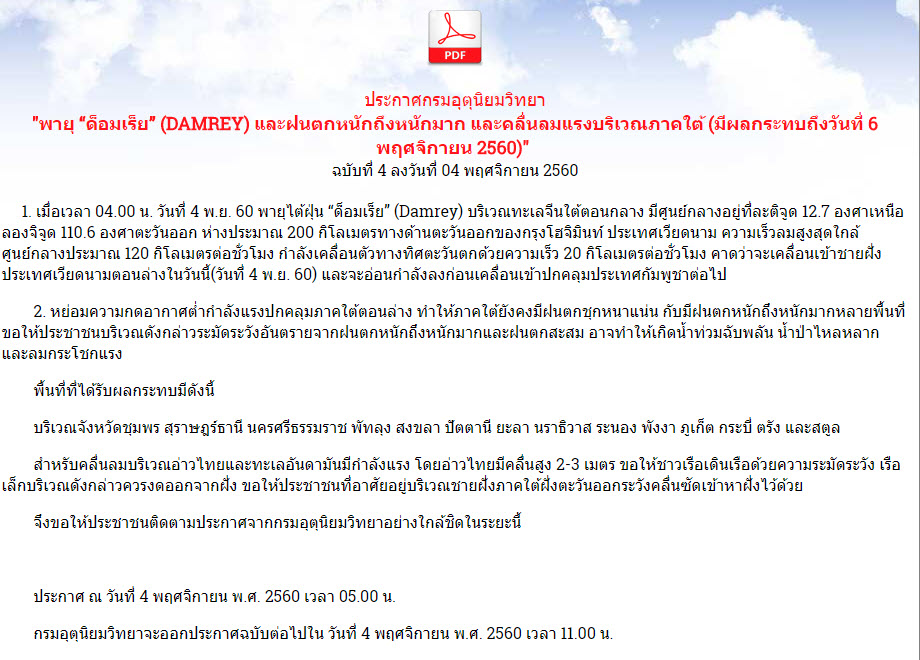 กรมอุตุนิยมวิทยา ประกาศเตือน พายุ “ด็อมเร็ย” (DAMREY) และฝนตกหนักถึงหนักมาก คลื่นลมแรงบริเวณภาคใต้ โดยมีผลกระทบถึงวันที่ 6 พฤศจิกายน 2560
