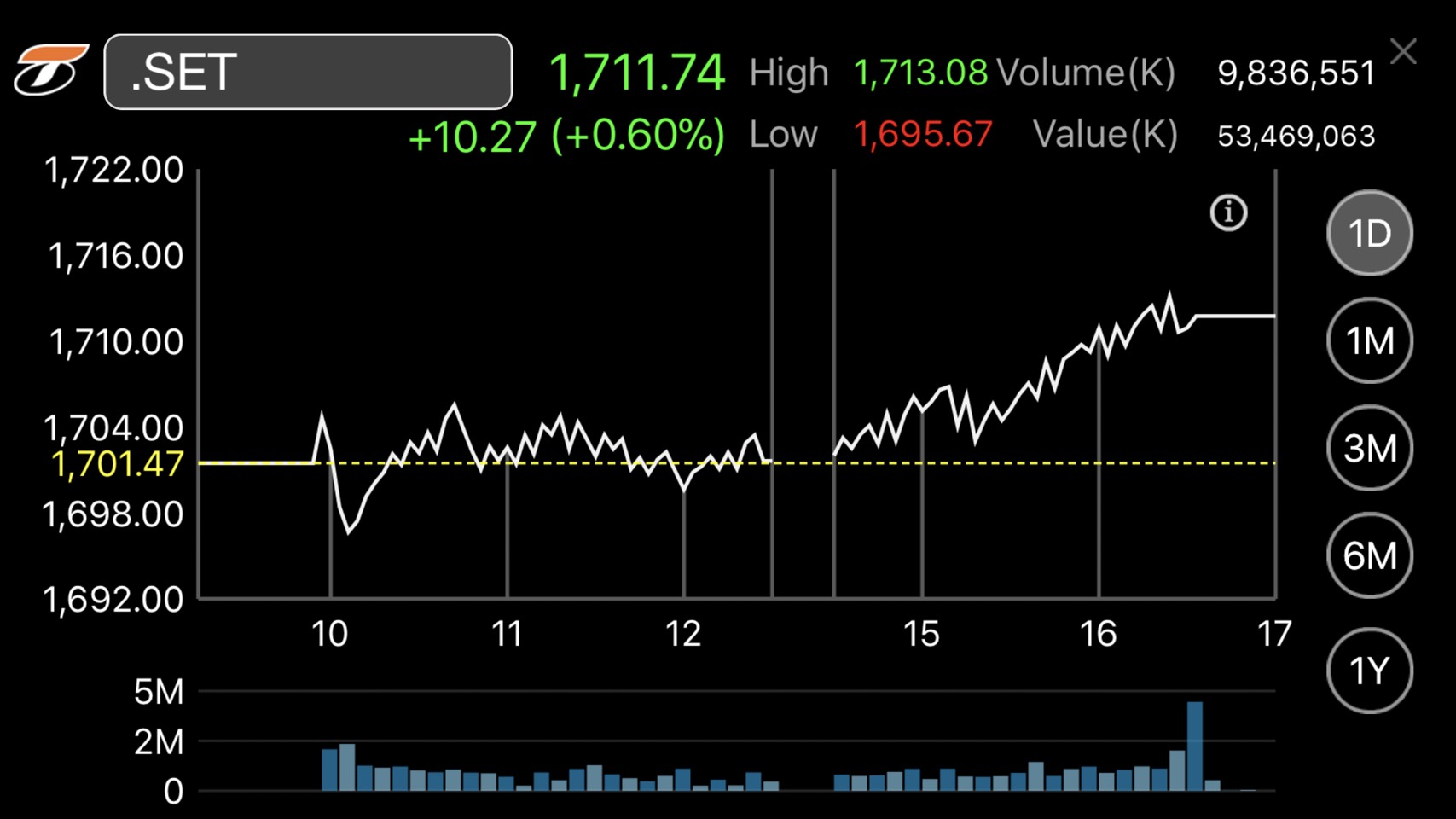 ผู้สื่อข่าวรายงานว่าดัชนีตลาดหลักทรัพย์ฯ ปิดที่ระดับ 1,711.74 จุด เพิ่มขึ้น 10.27 จุด หรือร้อยละ 0.60 มูลค่าการซื้อขาย 53,469.06 ล้านบาท การซื้อขายหุ้นวันนี้ ดัชนีหุ้นไทยเคลื่อนไหวทั้งในแดนบวก-ลบ โดยดัชนีฯแตะจุดสูงสุดที่ 1,713.08 จุด และแตะจุดต่ำสุดที่ระดับ 1,695.67 จุด