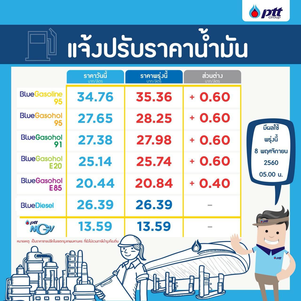 กรุงเทพฯ 7 พ.ย. – บมจ.ปตท.และบางจากฯ ประกาศปรับขึ้นราคาขายปลีกน้ำมันเบนซินและแก๊สโซฮอล์ 60 สตางค์ต่อลิตร ยกเว้น E85 ขึ้น 40 สตางค์ต่อลิตร ส่วนดีเซลคงเดิม มีผลวันที่ 8 พฤศจิกายน เวลา 05.00 น. เป็นต้นไป โดยราคาขายปลีกเป็นดังนี้ เบนซิน 95 อยู่ที่ 35.36 บาท แก๊สโซฮอล์ 95 อยู่ที่ 28.25 บาท แก๊สโซฮอล์ 91 อยู่ที่ 27.98 บาท E20 อยู่ที่ 25.74 บาท E85 อยู่ที่ 20.84 และดีเซล 26.39 บาทต่อลิตร โดยราคาขายปลีกข้างต้นยังไม่รวมภาษีบำรุงกรุงเทพมหานคร