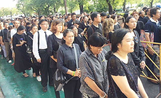 วันนี้ (17 ต.ค.) เป็นวันที่ 3 ที่สำนักพระราชวัง เปิดให้พสกนิกรเข้าถวายสักการะพระบรมศพเบื้องหน้าพระบรมฉายาลักษณ์และลงนามสมุดหลวงเพื่อถวายความอาลัยพระบาทสมเด็จพระปรมินทรมหาภูมิพลอดุลยเดชระหว่างเวลา08.30-16.00 น.ที่ศาลาสหทัยสมาคม ในพระบรมมหาราชวัง โดยแม้จะเป็น วันทำงานแต่ประชาชนจำนวนมากยังหลั่งไหลมาจนแถวยาว ไปจนถึงหน้าอาคารถาวรวัตถุ หรือตึกแดง บริเวณสนามหลวง โดยบางรายมาเข้าแถวรอตั้งแต่ 06.00 น. เนื่องจากต้องการเข้าสักการะพระบรมศพเป็นกลุ่มแรกๆ