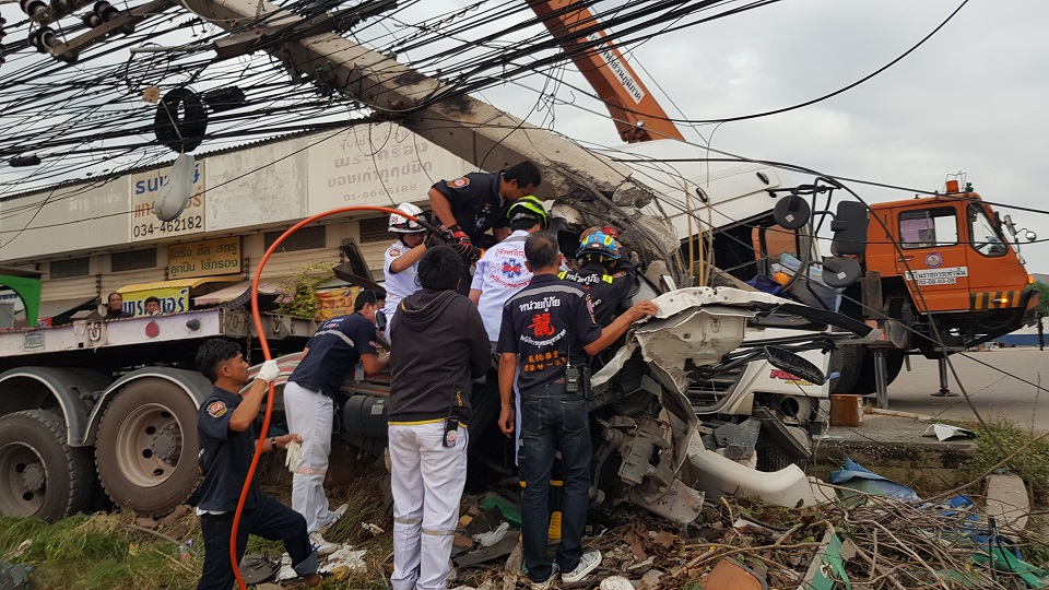 ร.ต.ท.พลกฤษณ์ เกิดชัย รองสารวัตร (สอบสวน) สภ.เมืองสมุทรสาคร รับแจ้งเหตุเวลาประมาณ 05.30 น. วันนี้ (9 พ.ย.) รถพ่วงเทรลเลอร์บรรทุกแผ่นเหล็กม้วนน้ำหนัก 14 ตัน 2 ม้วน ชนเสาไฟฟ้าโค่นทับบนถนนพระราม 2 ช่องคู่ขนาน ขาเข้ากรุงเทพฯ หลักกิโลเมตรที่ 31+900 ห่างจากทางเข้านิคมอุตสาหกรรมสมุทรสาครประมาณ 700 เมตร ต.ท่าจีน อ.เมือง จ.สมุทรสาคร จึงประสานมูลนิธิการกุศลสมุทรสาครร่วมช่วยเหลือและประสานการไฟฟ้าส่วนภูมิภาคตัดกระแสไฟชั่วคราว ก่อนนำศพคนขับติดอยู่ในตัวรถพ่วงออกมาได้คือ นายสุชาติ ประจวบสุข อายุ 63 ปี ชาว จ.มหาสารคาม นอกจากนี้ เหล็กม้วนยังหล่นไปกระแทกท้ายรถสิบล้ออีกคัน