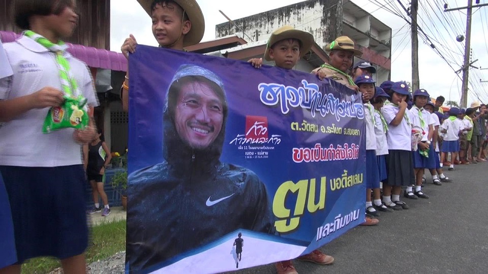 บรรยากาศการวิ่งเที่ยงวันนี้ (9 พ.ย.) ในจังหวัดสงขลา ซึ่งเป็นการวิ่งเบตง-แม่สาย ของนายอาทิวราห์ คงมาลัย หรือ ตูน บอดี้สแลม นักร้องดัง พร้อมทีมงานในโครงการก้าวคนละก้าว สามารถวิ่งได้แล้ว 3 เซท ในพื้นที่อำเภอสทิงพระเข้าสู่อำเภอระโนด จังหวัดสงขลา โดยมีจุดแวะพักที่โรงพยาบาลส่งเสริมสุขภาพประจำตำบลระวะ อำเภอระโนด ท่ามกลางประชาชนและหน่วยงานต่าง ๆ มารอให้การต้อนรับ พร้อมมอบเงินสมทบเข้าโครงการ โดยในเส้นทางผ่านเซทที่ 3 มีกลุ่มนักเรียนโรงเรียนสามบ่อวิทยา นักเรียนอนุบาลของโรงเรียนชุมชนบ้านสามบ่อ ยืนเข้าแถวให้การต้อนรับระยะทางยาวกว่า 1 กิโลเมตร พร้อมส่งเสียง “เรารักพี่ตูน พี่ตูนสู้ ๆ” ซึ่งตูนและทีมงานได้ชะลอความเร็ว เพื่อพูดทักทายกับกลุ่มนักเรียนไปตลอดว่าให้ตั้งใจเรียน